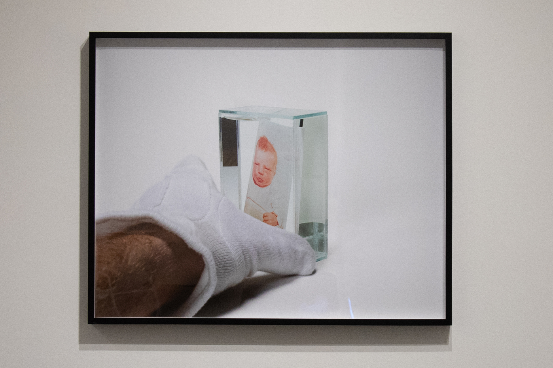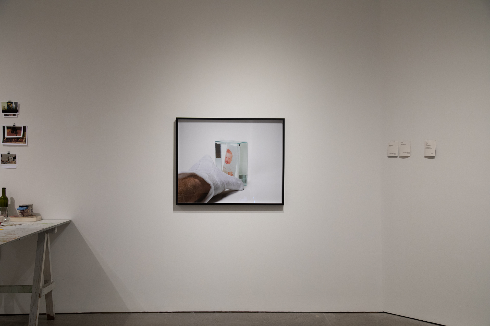 Cette photographie documente Ma première photo, la première œuvre d’une série visant la destruction de la totalité des images représentant l’artiste dans ses archives personnelles. Cet acte irréversible sera poursuivi tout au long de sa vie, dans l’objectif de mettre à l’épreuve sa mémoire et sa capacité de désidentification.
