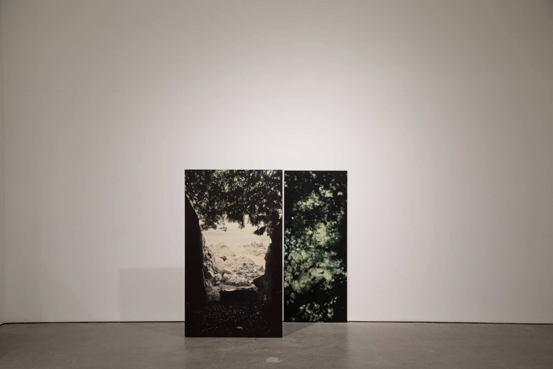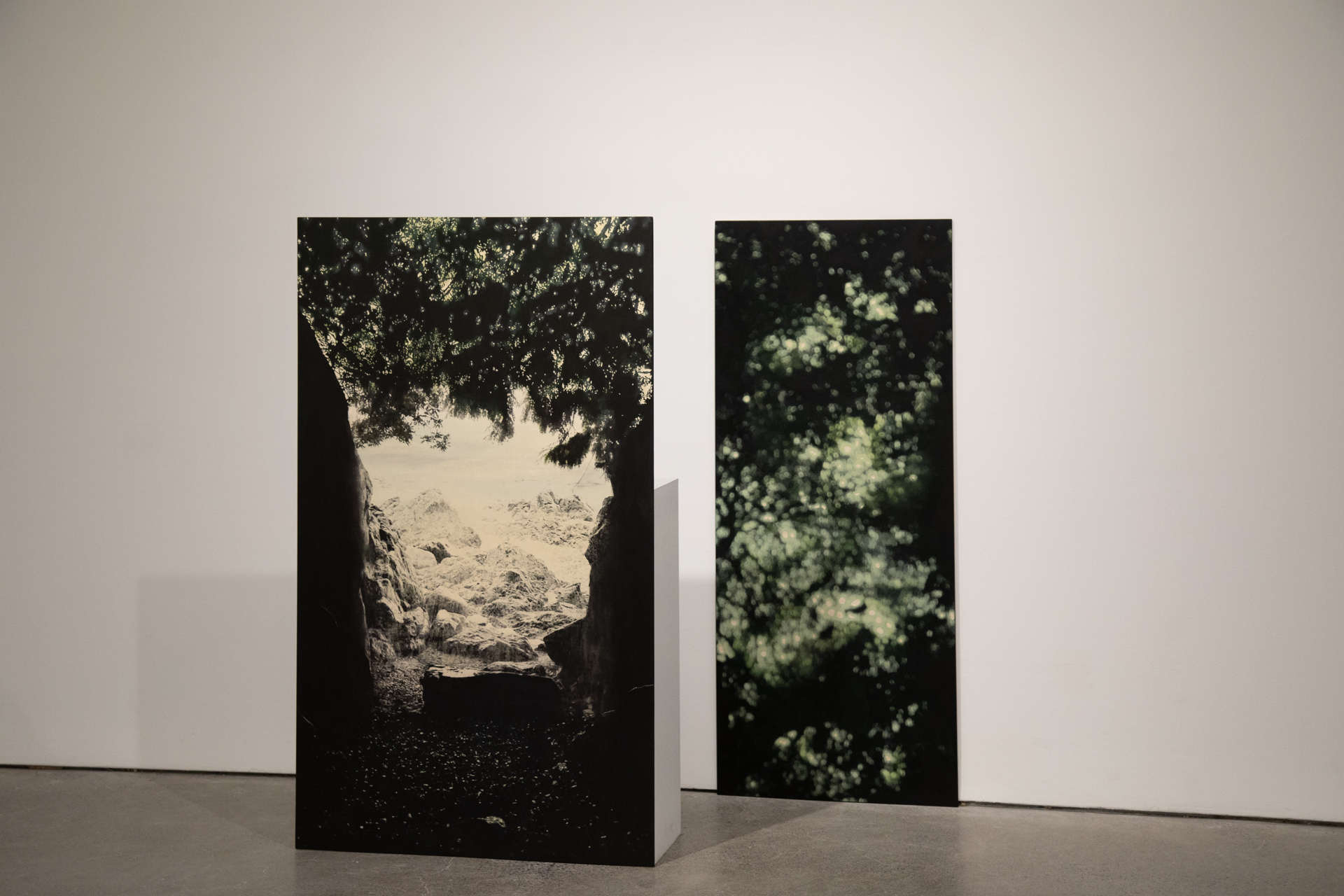 Hiatus, 2020 Sérigraphie, gravure et acrylique sur bois, socle Images : 152,4 x 91,44 cm, 152,4 x 60,96 cm et 24,13 x 19,05 cm