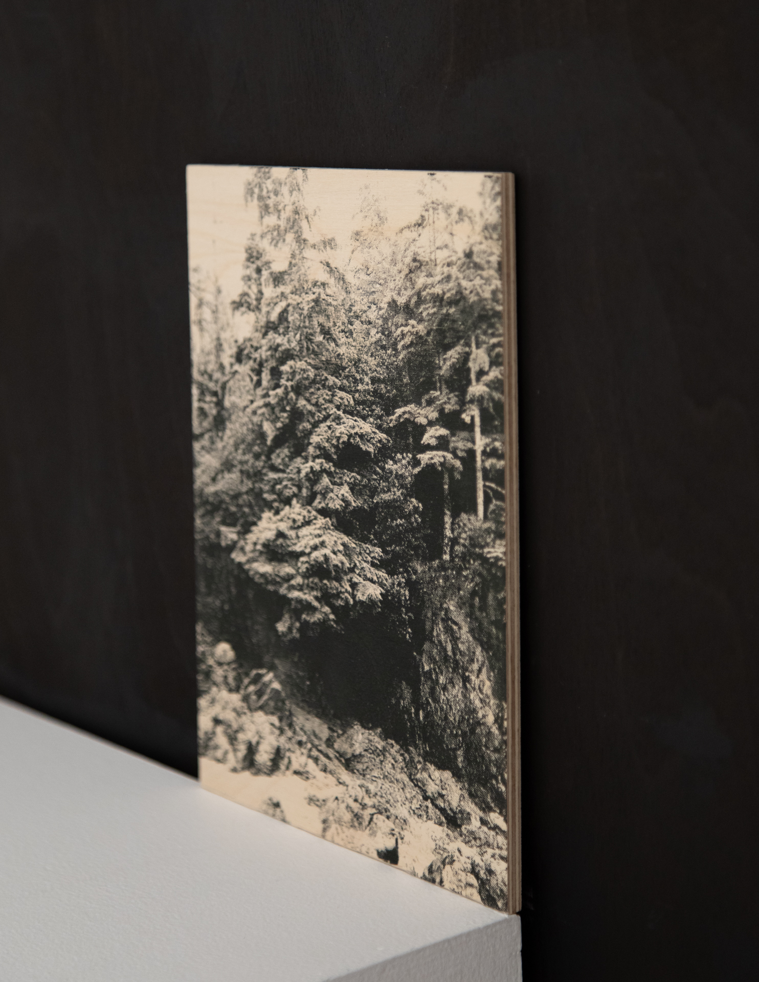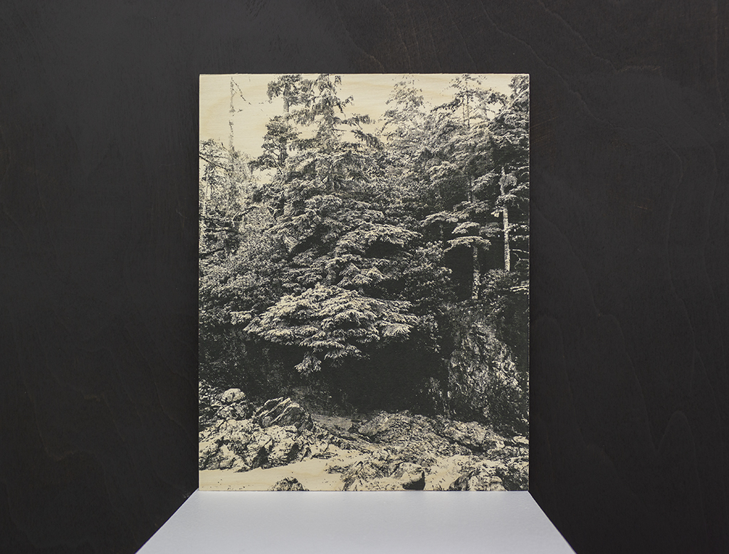 Ce triptyque interroge la relation entre l’espace représenté et l’espace physique en simulant une multiplicité de regards sur un seul et même lieu. Imprimées en sérigraphie directement sur le support de bois, puis gravées et retouchées, ces images sculpturales produisent un hiatus visuel – une sensation de décalage entre les trois espaces perçus.