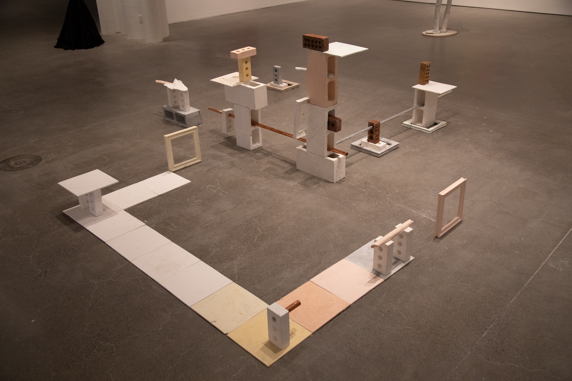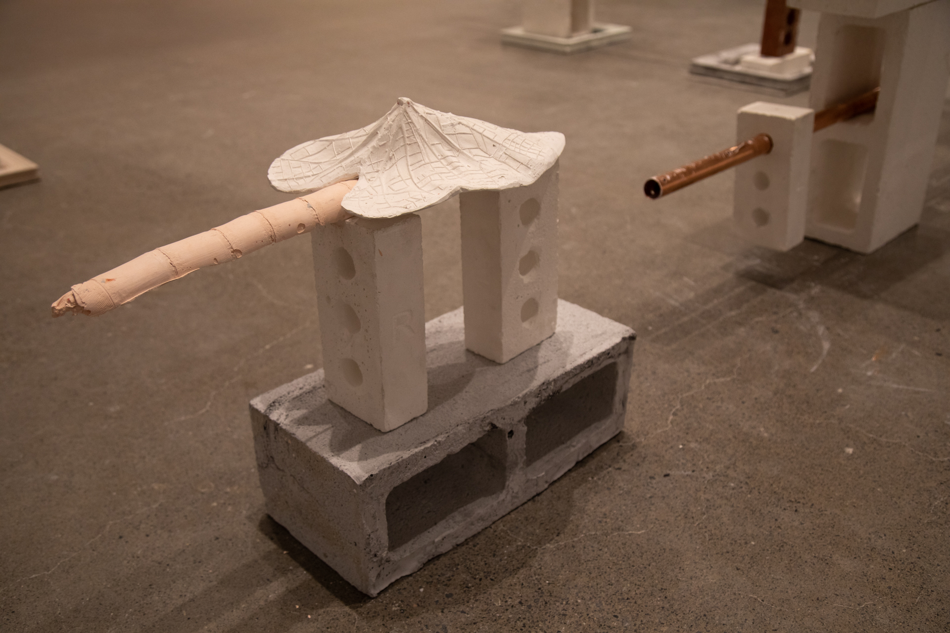 Mon portrait jusqu’ici ne m’a rien reproché, 2021 Plâtre, tuyau de cuivre et matériaux récupérés Dimensions variables, environ 400 x 400 cm