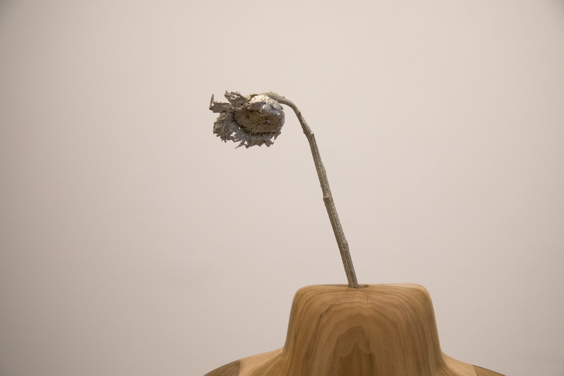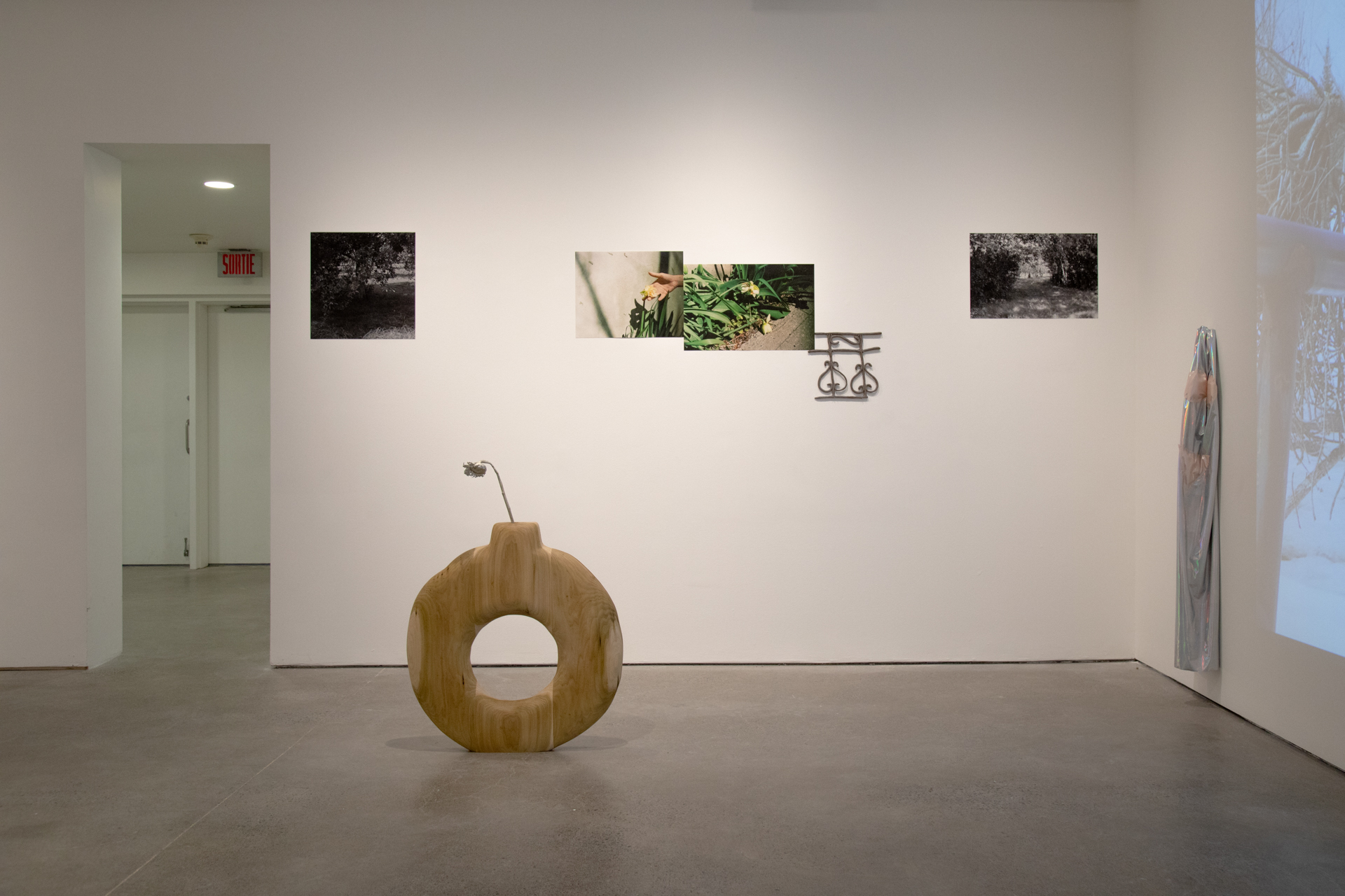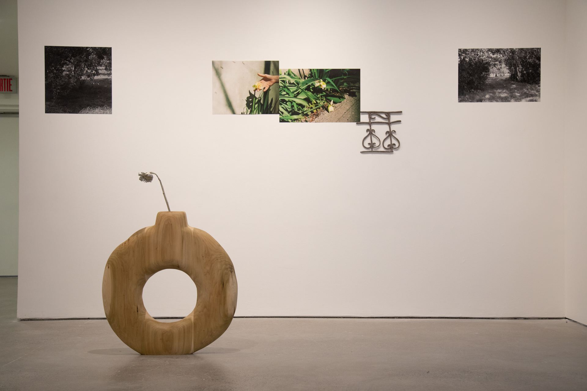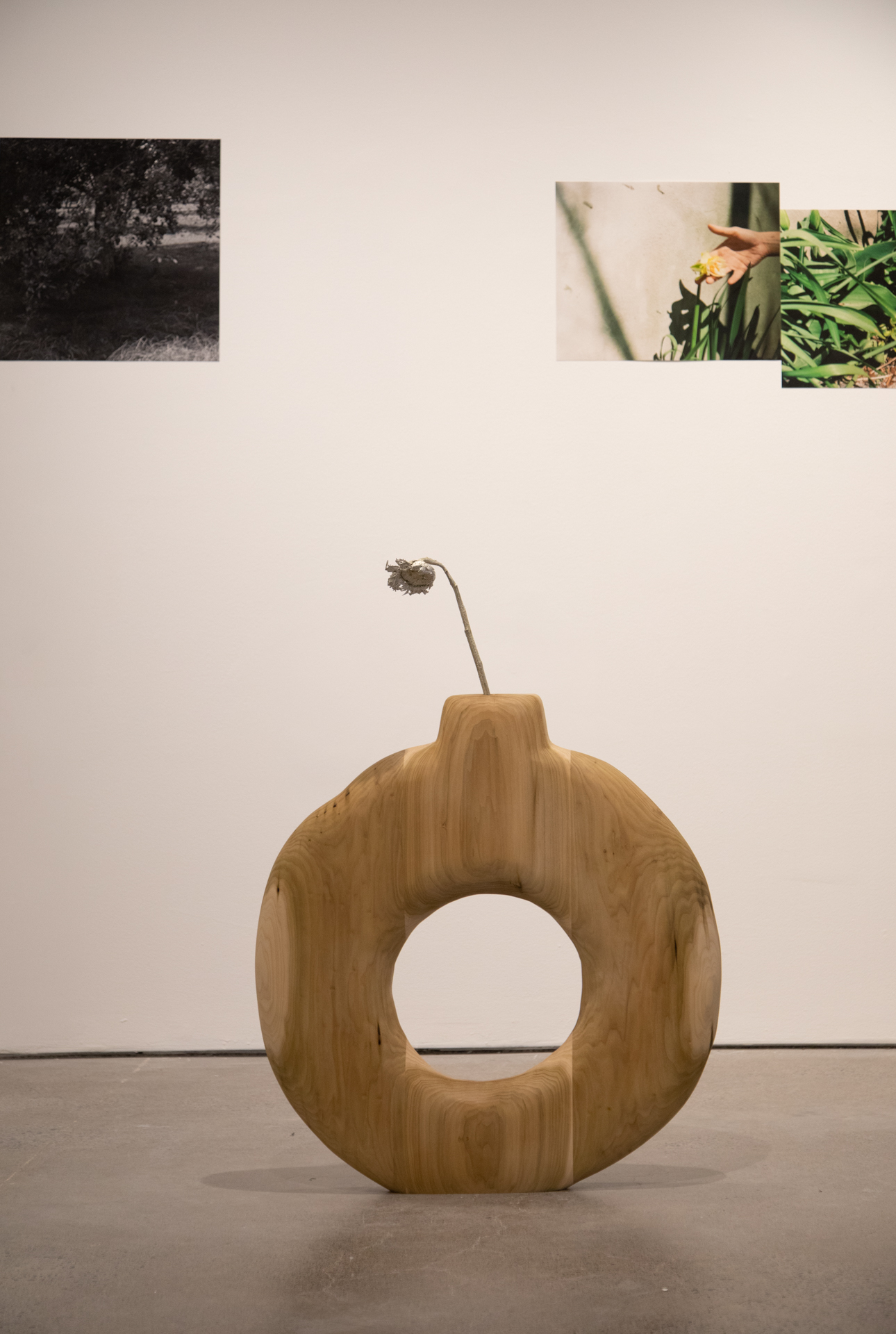 Jardin en (re)construction, mercredi, 2020 Bois de peuplier, céramique de grès, étain et photographie argentique numérisée et imprimée au jet d’encre sur papier Hahnemühle Agave Dimensions variables : sculpture 112 x 76 x 19 cm; photographies 40 x 61 cm, 40 x 50 cm et 49 x 48,5 cm; relief 31 x 37 x 1 cm