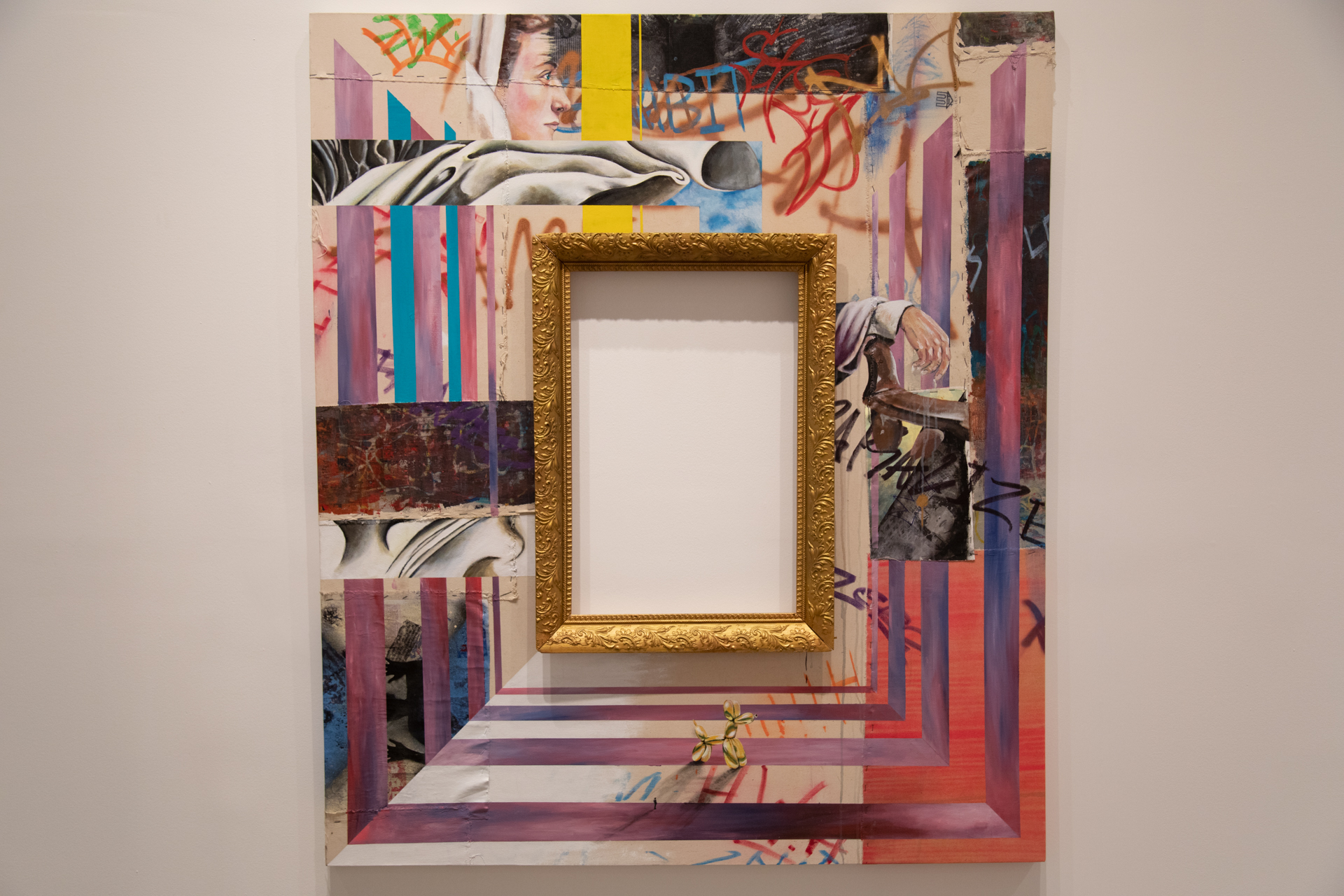 Après trois ans d’études en arts visuels, je constate que le lieu d’exposition d’une œuvre a souvent autant, sinon plus, d’importance que l’œuvre elle-même. Glorifiant le mur blanc de la galerie et repoussant la peinture à la marge, ce tableau-cadre est pour moi une synthèse de mes apprentissages sur les plans technique, conceptuel et historique.