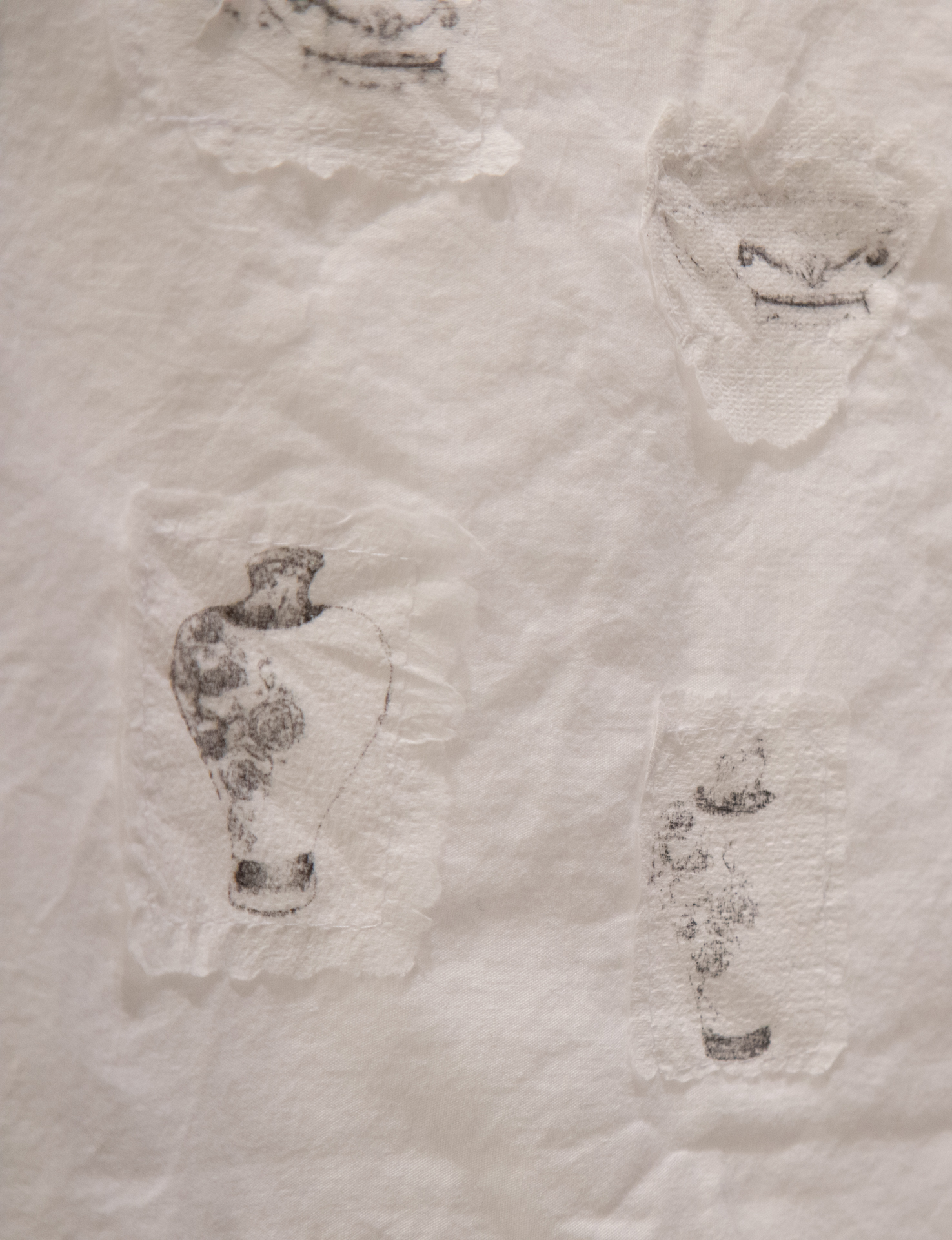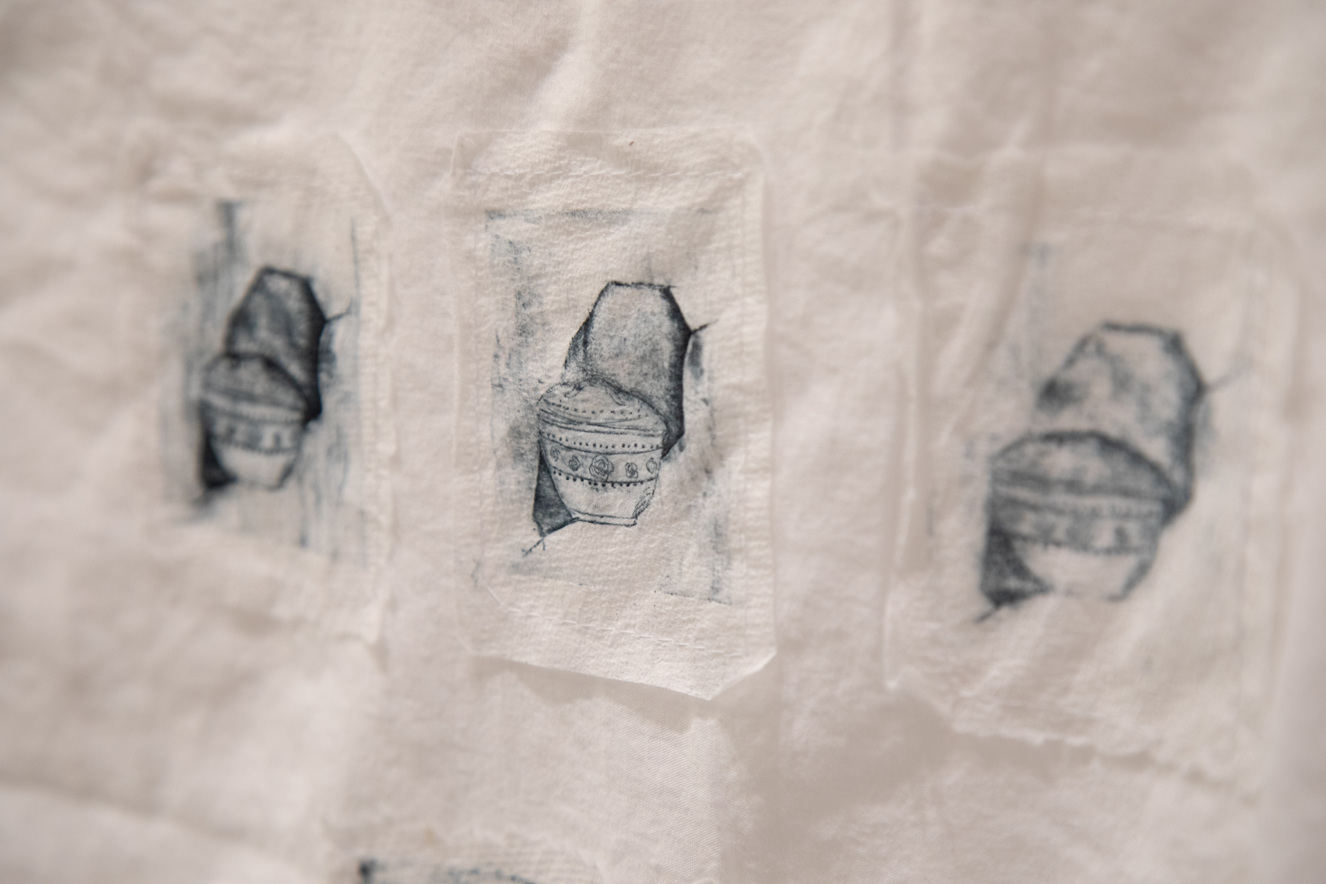 Ma façon de travailler en gravure rappelle la fragilité des vaisselles en porcelaine. Cette œuvre rappelle plus précisément la vie de ma grand-mère, atteinte de la maladie d’Alzheimer. Les impressions fantomatiques réalisées avec des ustensiles et imprimées sur papiers essuie-tout évoquent l’effacement graduel de sa mémoire. La corde à linge, le drap et l’essoreuse renvoient à son quotidien d’autrefois, lorsqu’elle était femme au foyer.