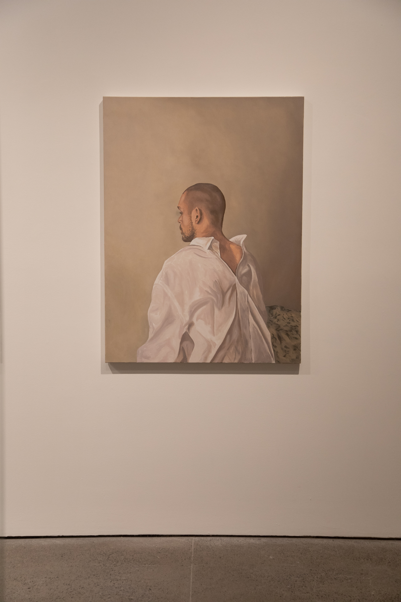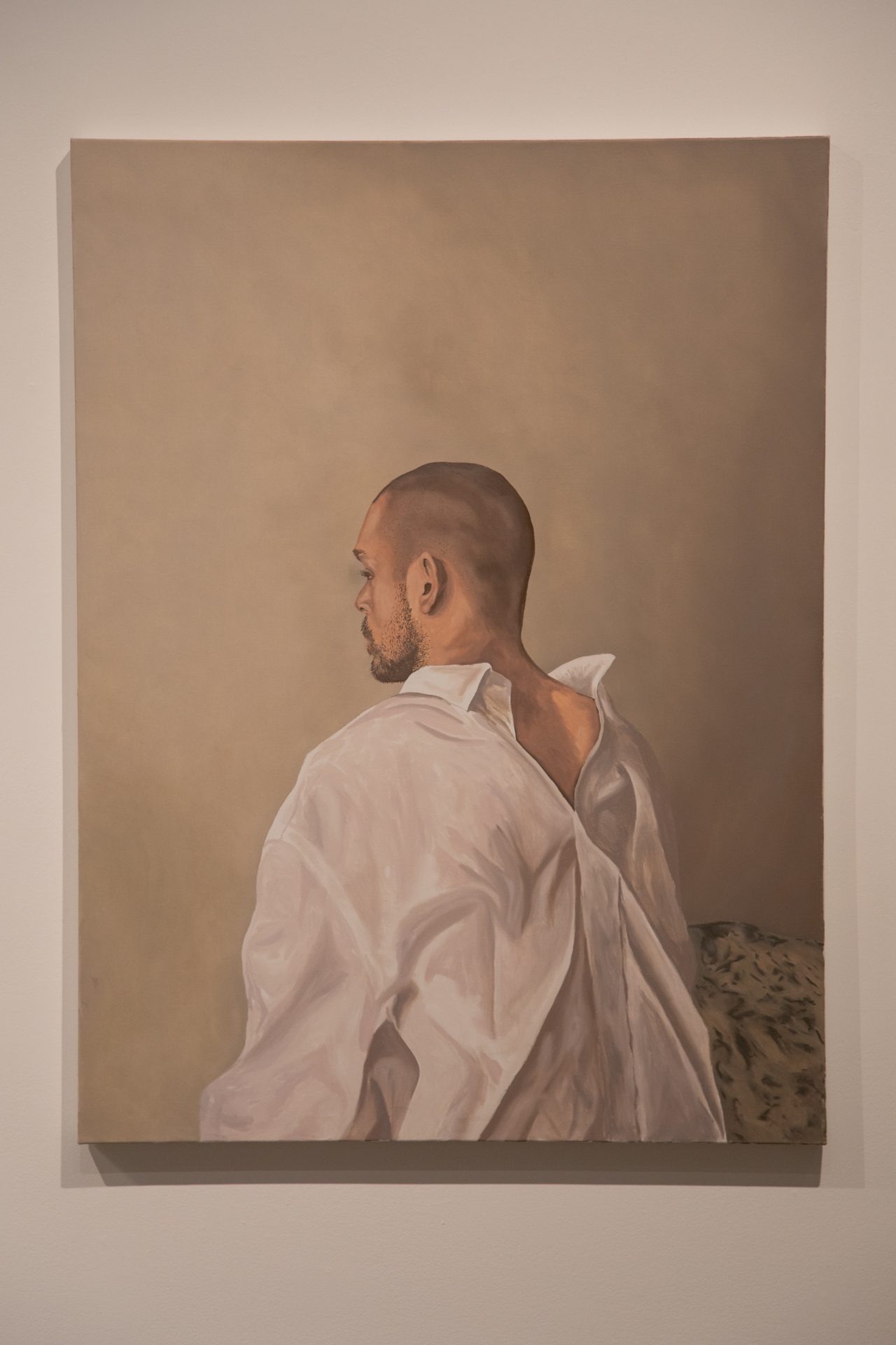 Ce portrait énigmatique interroge la symbolique de la chemise blanche, l’importance des vêtements dans la construction de l’identité masculine et le mythe de la virilité qui en découle. Sortie de son cadre professionnel habituel, la chemise est ici portée à l’envers, relâchée, et plissée jusqu’à évoquer un drapé. Dénué est ainsi un portrait singulier qui, tournant le dos, détourne identités et conventions