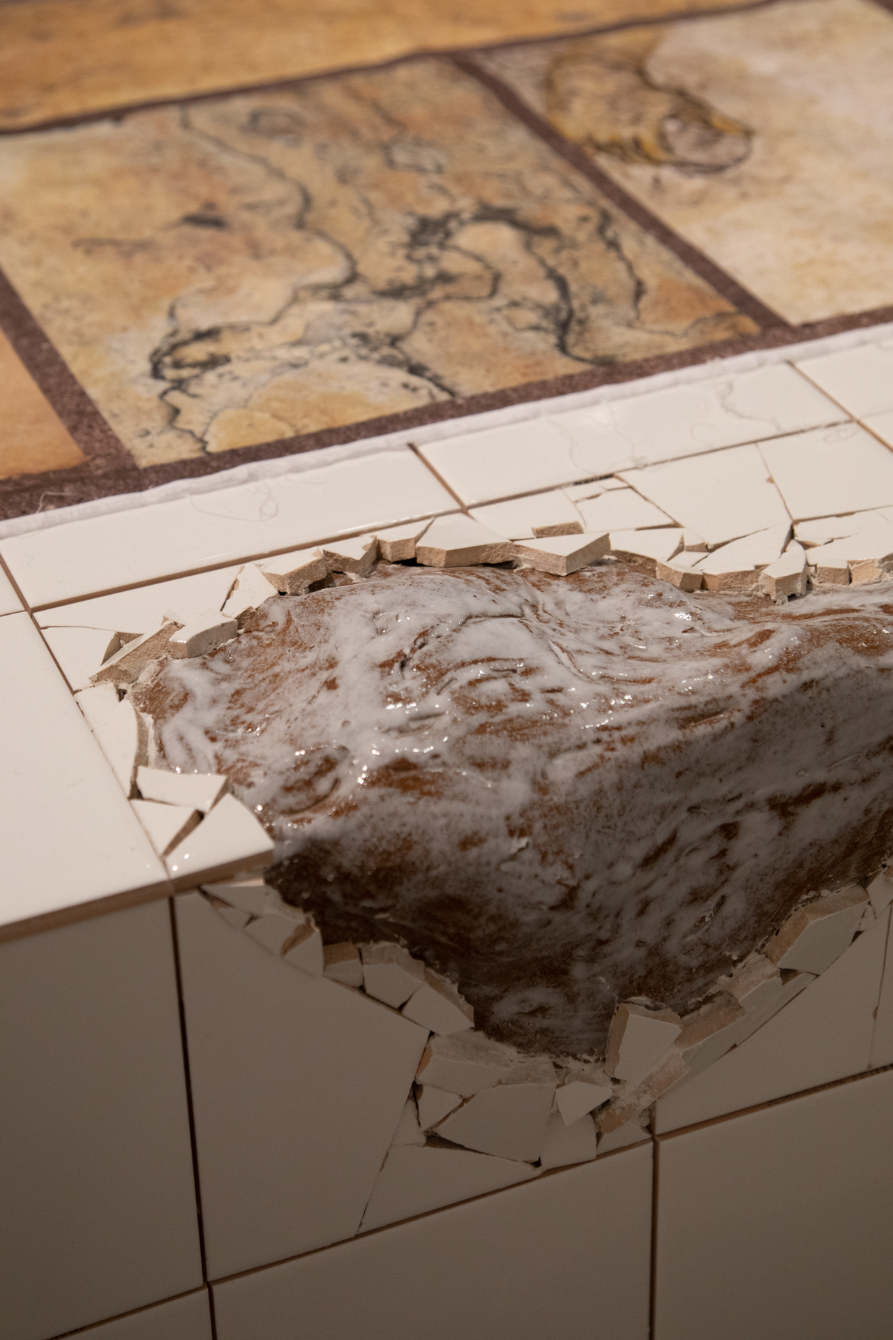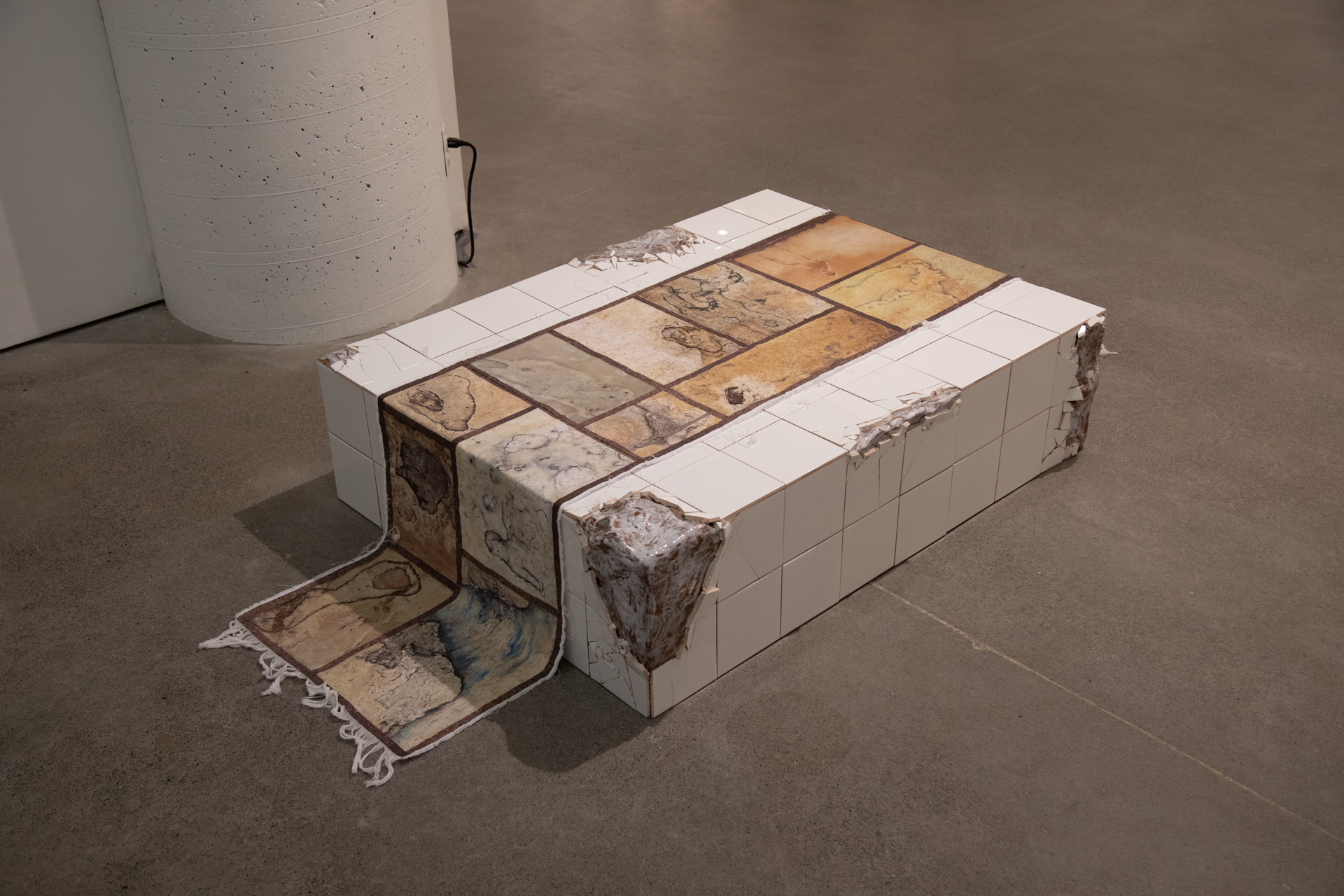 Le sol que je foule tous les jours, 2020 Impression à jet d’encre, crayon de couleur et aquarelle sur tissu, bois, céramique et glaçure 270 x 90 x 30 cm
